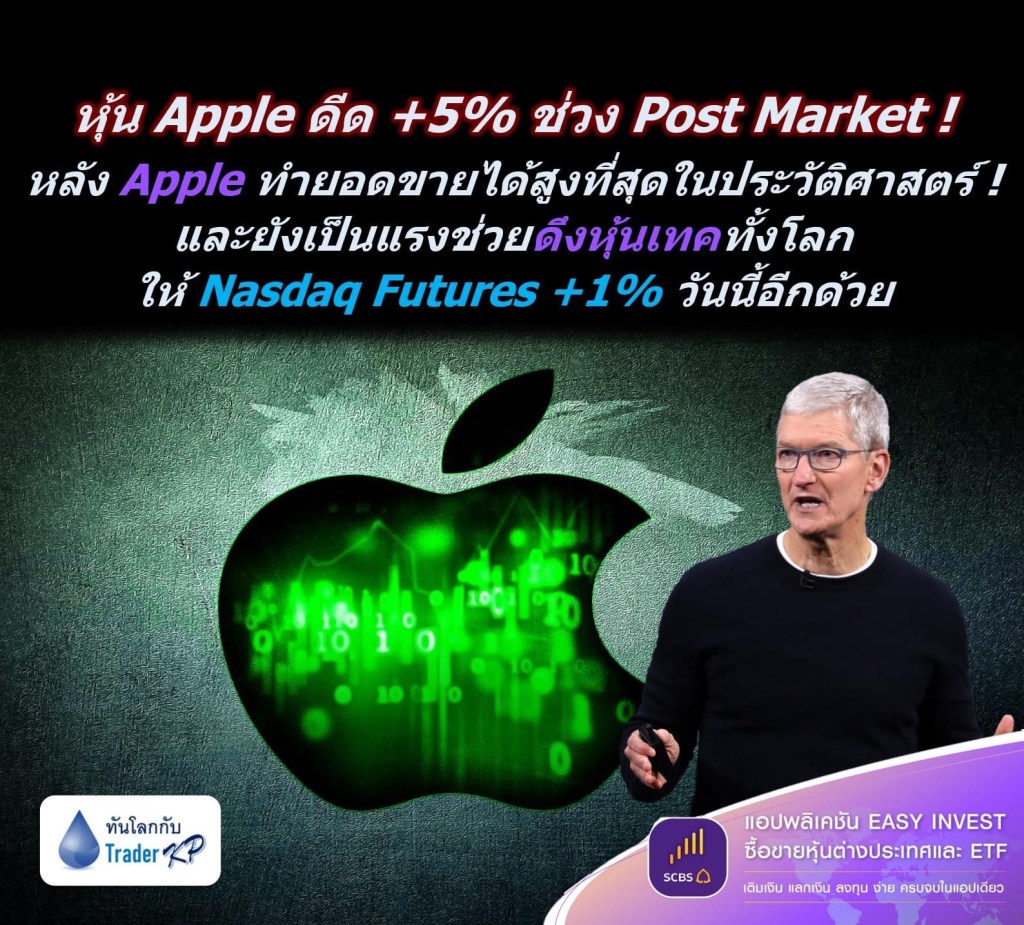 📌 การที่งบของ Apple ออกมาดีกว่าที่คาด นอกจากจะทำให้ราคาหุ้นดีด +5% แล้ว ยังเป็นแรงช่วยดึงหุ้นเทคทั้งโลกให้ Nasdaq Futures +1% วันนี้อีกด้วย