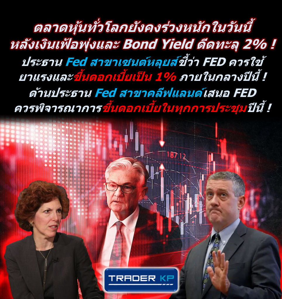 ทางประธาน Fed สาขาเซนต์หลุยส์ชี้ว่า FED ควรใช้ยาแรง โดยการขึ้นดอกเบี้ยเป็น 1% ภายในกลางปีนี้ ! ด้านประธาน Fed สาขาคลีฟแลนด์เสนอ FED ควรพิจารณาการขึ้นดอกเบี้ยในทุกการประชุมที่จะมีในปีนี้ !