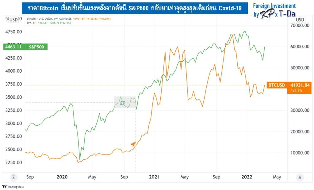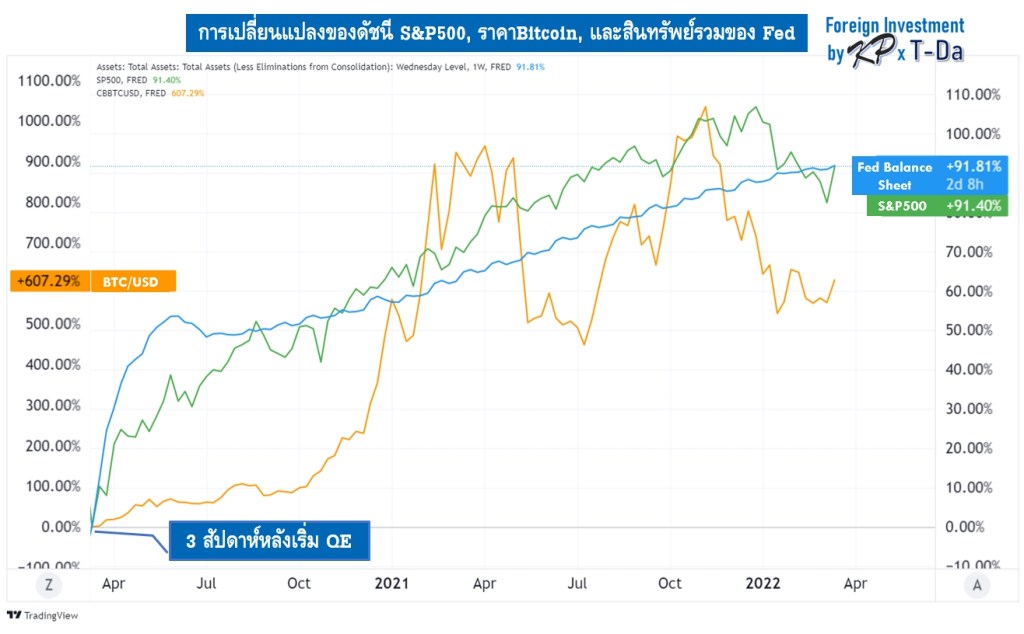 ราคา Bitcoin เริ่มปรับเป็นขาขึ้นชัดเจนในเดือน ตค. 2020 ถ้าย้อนกลับไปดูรายละเอียดจะพบว่าเมื่อการระบาดของ Covid-19 ทำให้ Fed ประกาศหลังการประชุมในวันที่ 15 มี.ค. 2020 ว่าจะอัดฉีดปริมาณเงินเข้าสู่ตลาดการเงิน (Quantitative Easing : QE) หลังจากนั้น 3 สัปดาห์ปริมาณเงินมหาศาลก็ทำให้ตลาดหุ้นปรับตัวขึ้น และเมื่อดัชนี S&P500 ปรับตัวกลับขึ้นไปสูงกว่าจุดสูงสุดเดิมก่อน Covid-19 (3,400จุด) แต่ยังไม่สามารถทะลุระดับ 3,600 จุดขึ้นไปต่อได้ ตลาดหุ้นก็เริ่มผันผวนในช่วงเดือน ก.ย.-ต.ค. 2020 (เพราะ valuation ของหุ้นเริ่มดูแพงแล้วเทียบกับพื้นฐานเศรษฐกิจจริง ณ ขณะนั้น) แต่ด้วยปริมาณเงิน QE ที่ยังอัดฉีดเข้ามาอย่างต่อเนื่อง เราก็เริ่มเห็นการปรับเป็นขาขึ้นของ Bitcoin อย่างชัดเจนตั้งแต่นั้นมา พร้อมกับ S&P500 ที่ผ่านแนวต้านที่ 3,600จุด ขึ้นไปด้วยกันกับ cryptocurrencies ดังนั้นจึงไม่แน่แปลกใจว่าเมื่อ Fed เริ่มส่งสัญญาณจะขึ้นดอกเบี้ยตามด้วย QT ก็ทำให้ Bitcoin ปรับลงไปพร้อมกับราคาหุ้น และดูมีพฤติกรรมคล้ายไปทาง Risky Asset มากกว่า **ดูภาพประกอบ**