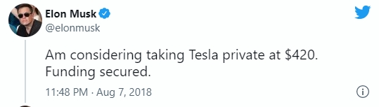 “Am considering taking Tesla private at $420. Funding secured.” Elon ทวีต