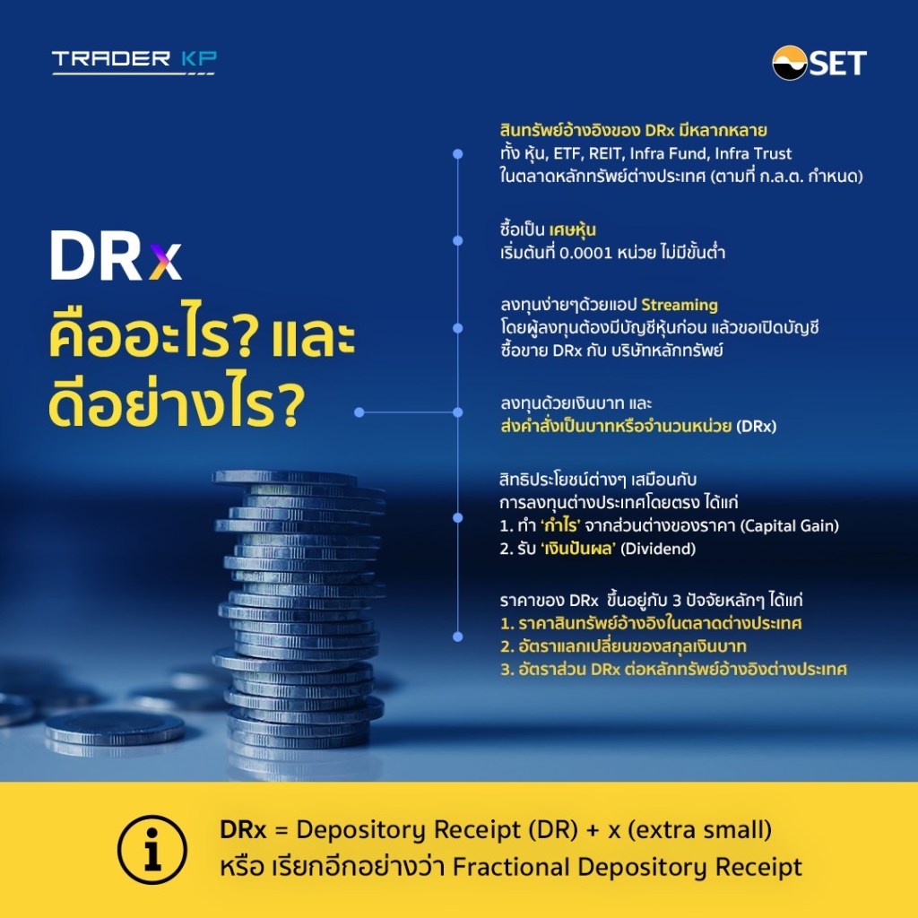 DRx ลงทุนง่าย / ซื้อขายหุ้นแบบ Realtime ไปพร้อมกับตลาดต่างประเทศ /ซื้อง่ายและขายคล่องด้วยเงินบาท โดยที่ไม่ต้องแลกเงิน / ไม่มีค่าซื้อขั้นต่ำ เและสามารถซื้อเป็นเศษส่วนหุ้นก็ยังได้