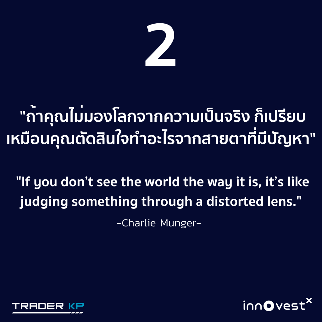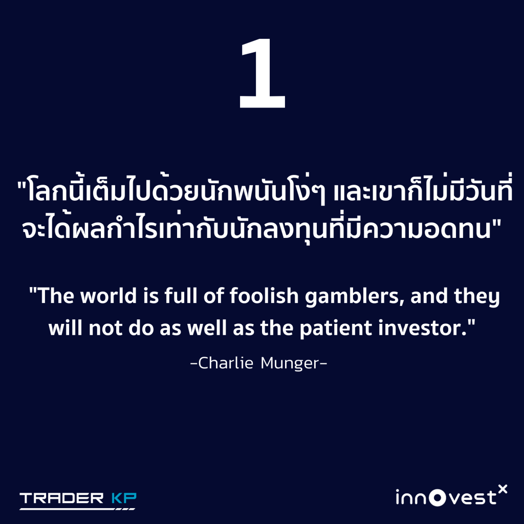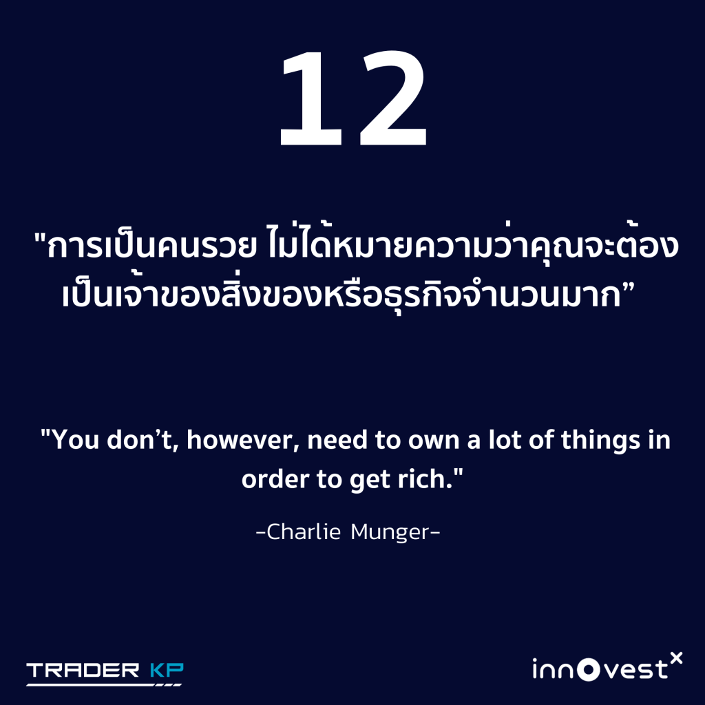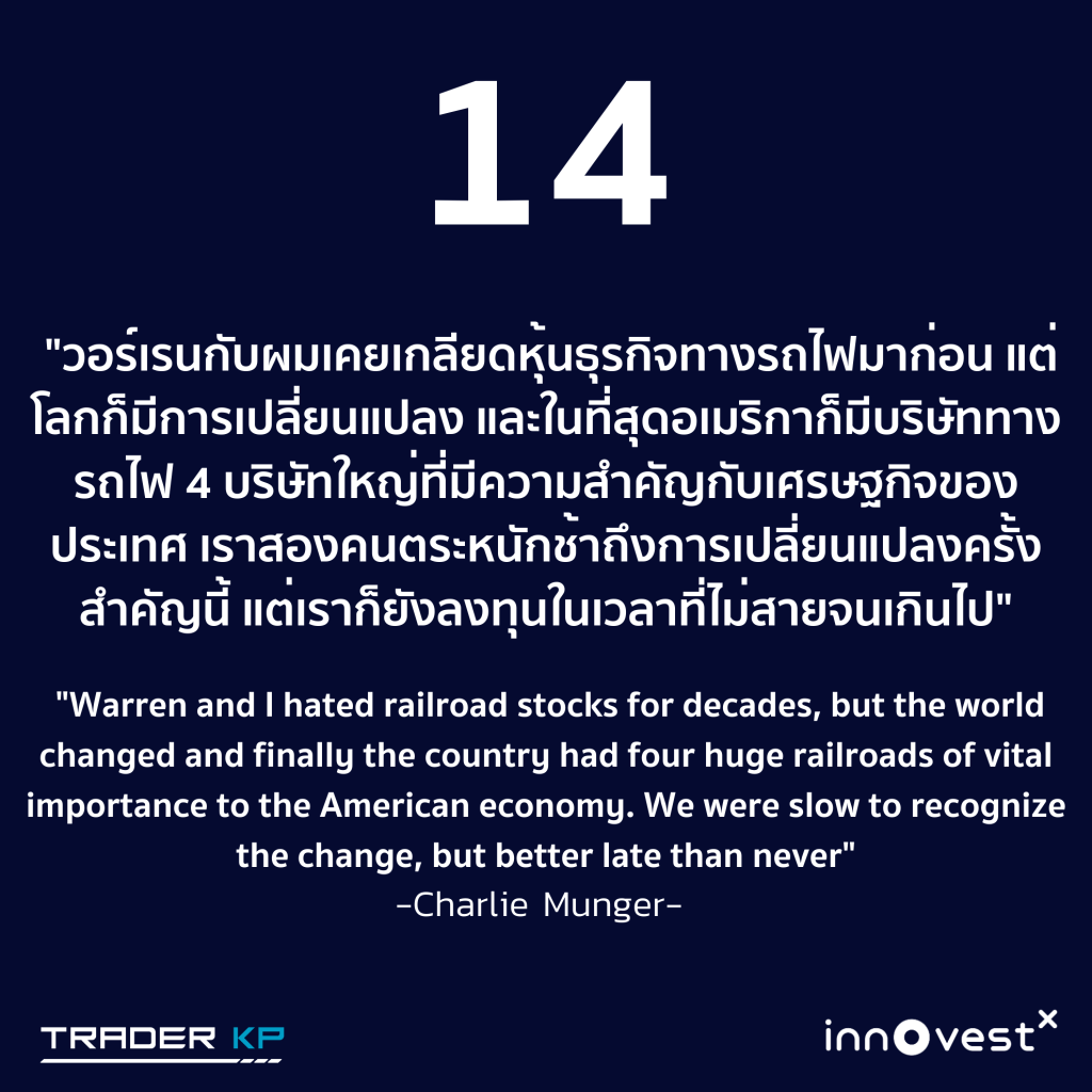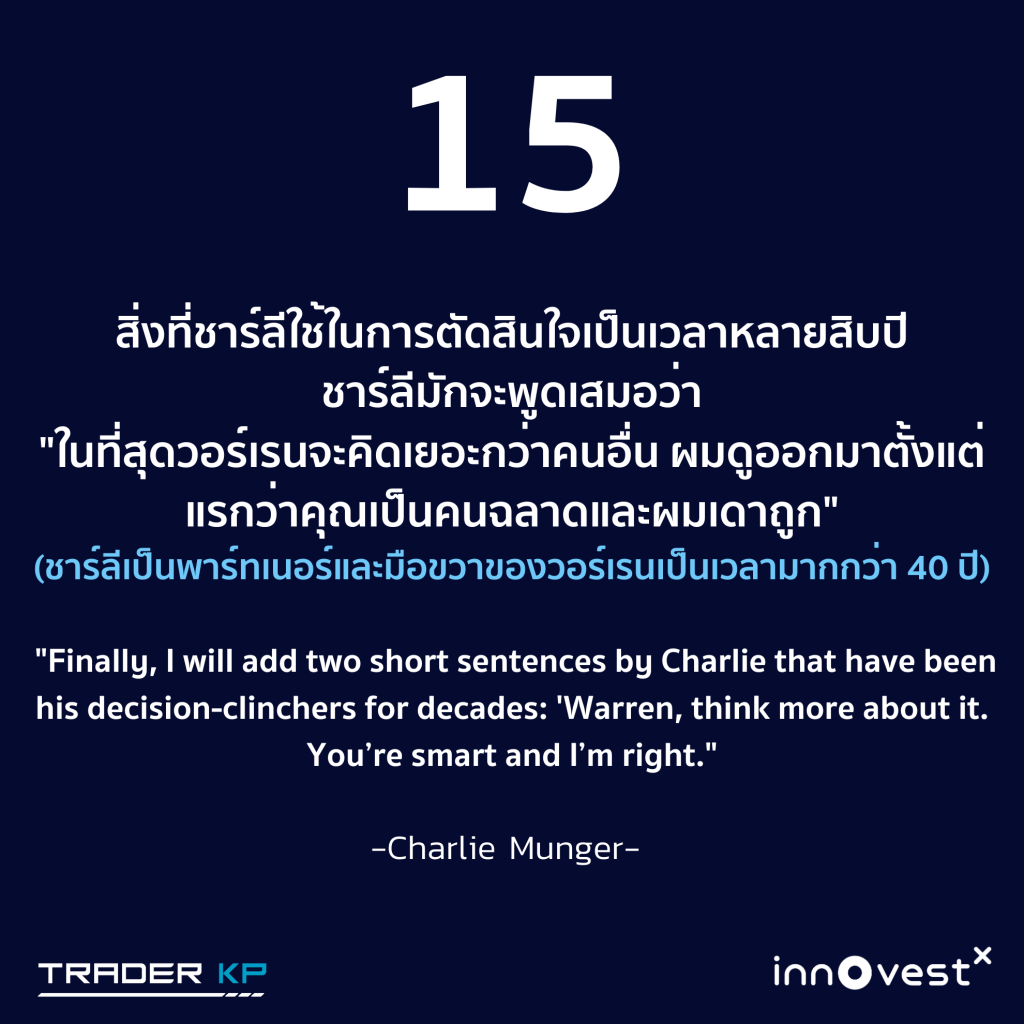 📌 วันนี้ Trader KP เลยอยากจะมาแชร์ส่วนหนึ่งของจดหมาย ที่ปู่ Warren ได้พูดถึงพาร์ทเนอร์คนสำคัญของเขา นั่นก็คือ Charlie Munger โดยปู่ Warren ได้บอกว่า ไม่มีอะไรที่จะดีไปกว่าการมีพาร์ทเนอร์ที่ดี – Nothing Beats Having a Great Partner และถึงแม้ Charlie จะมีความคิดที่ตรงกับ Warren เสมอ แต่ Charlie มักจะสรุปข้อคิดได้สั้นและลึกซึ้งมากกว่า ไม่มีสักครั้งที่เขาโทรหา Charlie แล้วจะไม่ได้ข้อคิดดีๆกลับมา ปู่เลยอยากเอามาแชร์ให้นักลงทุนได้ฟัง มีทั้งหมด 15 ข้อครับ