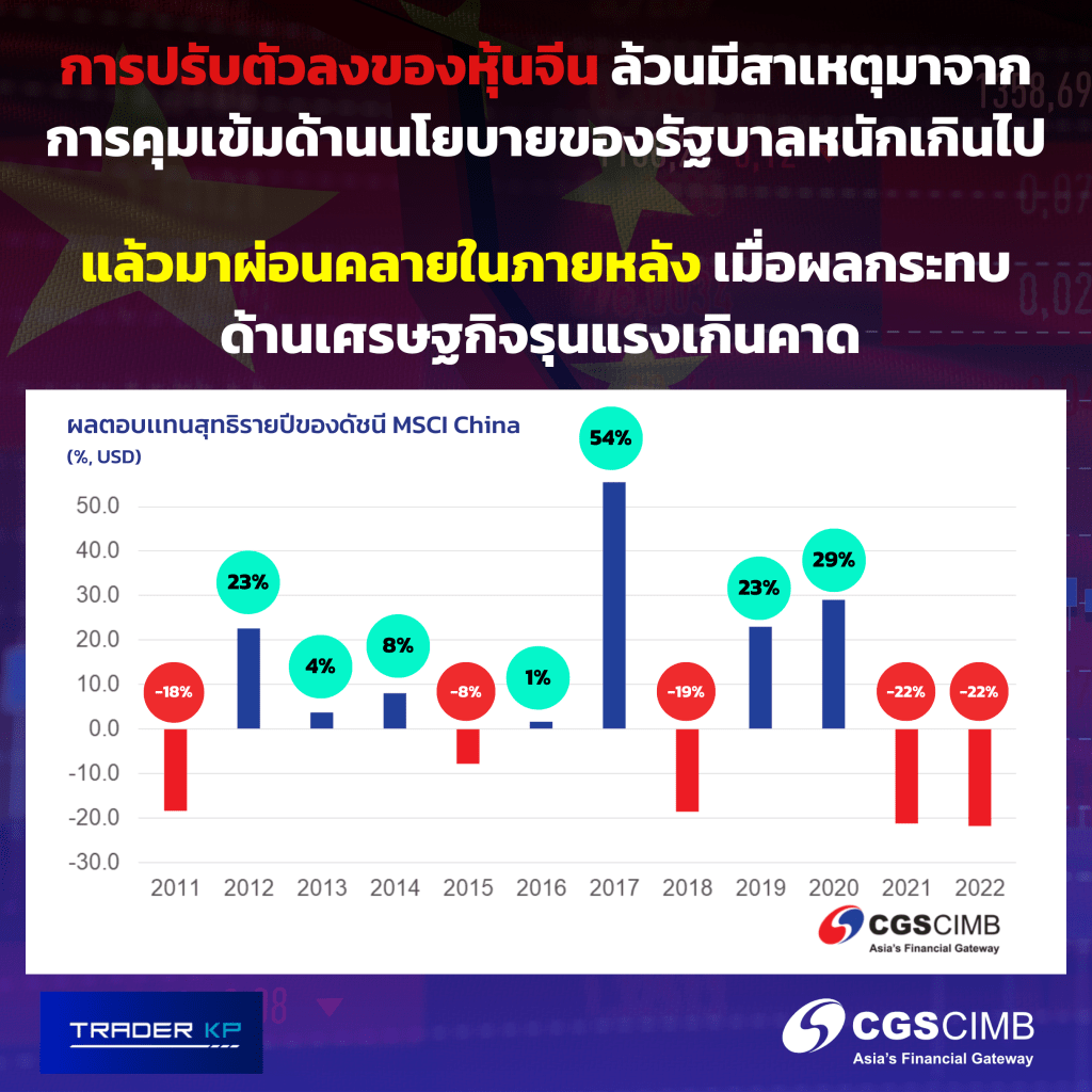 จากสถิติของดัชนี MSCI China ซึ่งประกอบด้วยหุ้นจีนกว่า 700 บริษัทที่จดทะเบียนอยู่ในตลาดหลักทรัพย์ทั่วโลก พบว่าการปรับตัวลงของหุ้นจีนอย่างมีนัยสำคัญตั้งแต่ปี 2011 เป็นต้นมาล้วนมีสาเหตุมาจากการคุมเข้มด้านนโยบายของรัฐบาลหนักเกินไป (Policy Overdone) ทั้งสิ้น แล้วมาผ่อนคลายในภายหลังเมื่อผลกระทบด้านเศรษฐกิจรุนแรงเกินคาด ยกเว้นแต่เพียงปี 2022 เท่านั้น