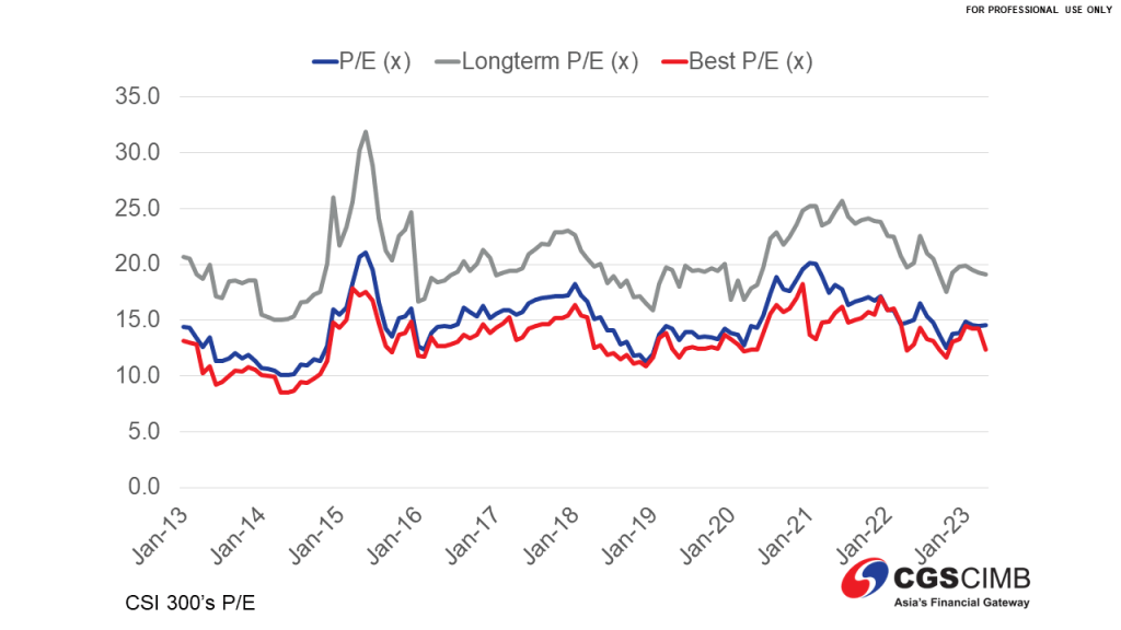 อย่างไรก็ดีค่า P/E Ratio ของหุ้นจีนในตลาดฮ่องกง (Hang Seng Index) และจีนแผ่นดินใหญ่ (CSI 300 Index) ในปัจจุบันได้ปรับตัวกลับขึ้นมาใกล้เคียงกับค่าเฉลี่ยในอดีตแล้ว เมื่อตัวเลขเศรษฐกิจของจีนในเดือน เม.ย. ที่เปิดเผยออกมาแย่กว่าที่ตลาดคาดไว้ จึงส่งผลให้นักลงทุนเริ่มมีการขายทำกำไร (Take Profit) หุ้นจีนออกมาจนทำให้หุ้นจีน (CSI 300 Index) กลับมาที่จุดเดิม ณ ตอนต้นปี 2023