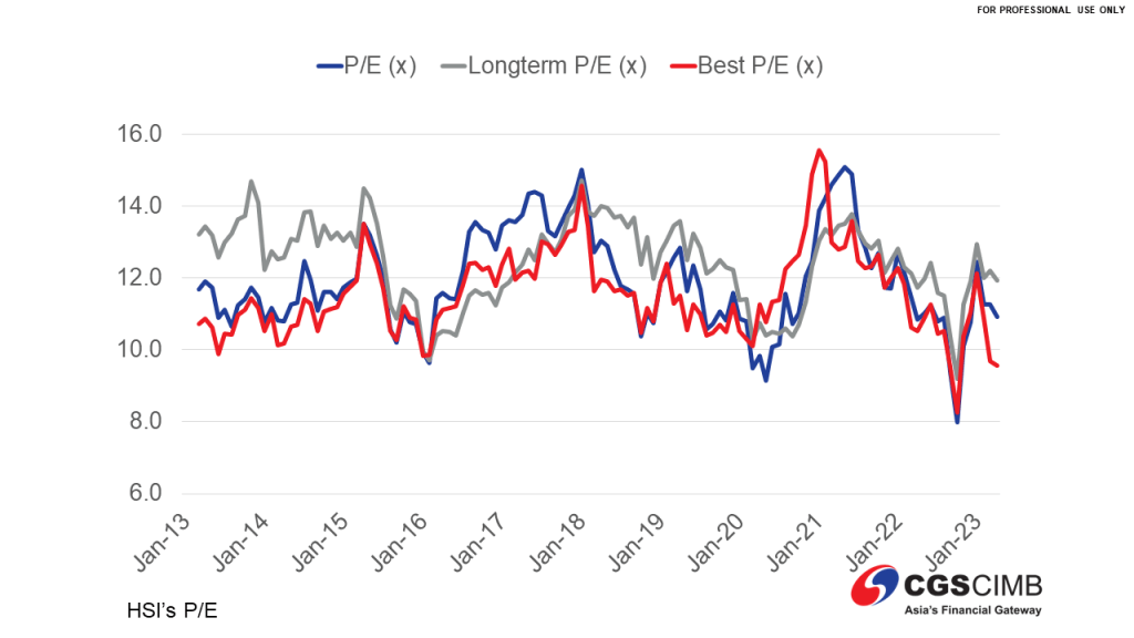 ✅ Hang Seng Index P/E Ratio ลงไปแตะระดับต่ำสุดที่ระดับ 6.7 เท่า ในไตรมาส4/2022 ก่อนจะฟื้นตัวมาอยู่ที่ 9.60 เท่าในปัจจุบัน (ค่าเฉลี่ย 10ปี = 10.19 เท่า และระดับ -1S.D. = 8.30 เท่า)