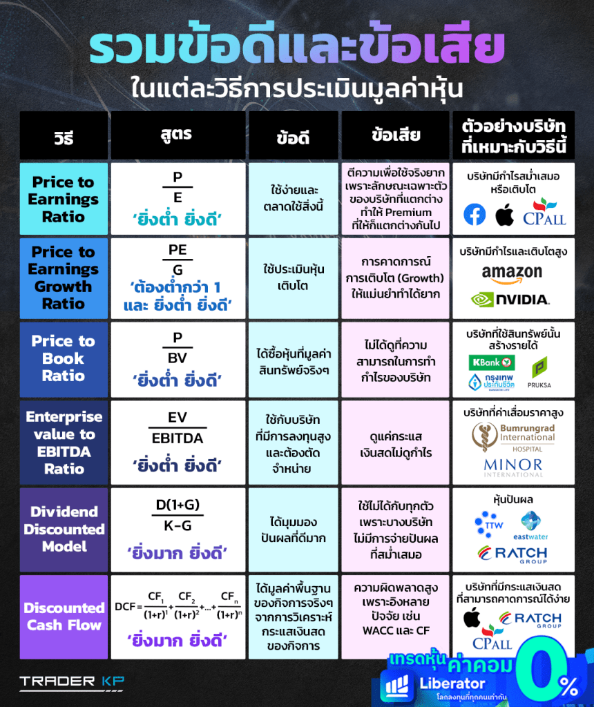 โดยส่วนใหญ่ นักลงทุนมักจะใช้ P/E ratio ในการประเมินมูลค่าหุ้น แต่จริงๆยังมีอีกหลากหลายวิธี ซึ่งแต่ละวิธีก็มีข้อดึ ข้อเสียแตกต่างกันไป