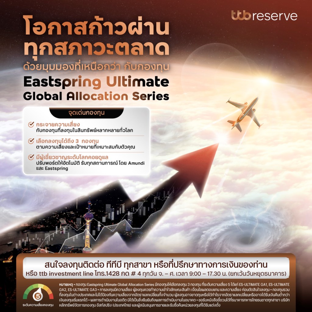 กับ กองทุน Eastspring Ultimate Global Allocation Series (ES-ULTIMATE GA) กองทุนที่เน้นลงทุนในหุ้นและตราสารหนี้คุณภาพทั่วโลกที่มีโอกาสเติบโต โดยมีผู้เชี่ยวชาญปรับพอร์ตให้อัตโนมัติ (ระดับความเสี่ยงกองทุน 5) ลงทุนง่ายไม่มีขั้นต่ำ