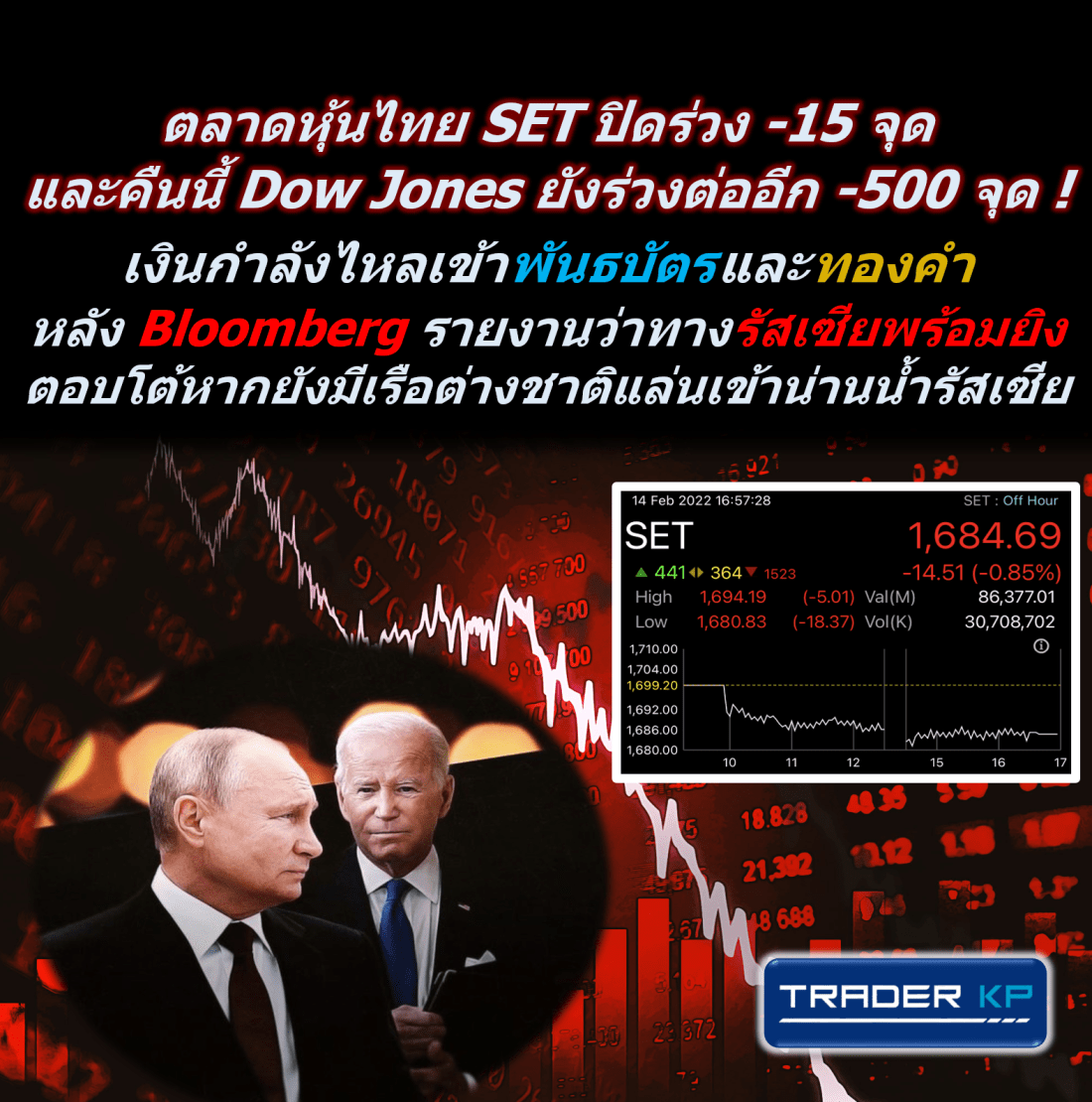 ตลาดหุ้นไทย SET ปิดร่วง -15 จุด และคืนนี้ Dow Jones ยัง … อ่านเพิ่มเติม Bloomberg รายงานว่าทางรัสเซียพร้อมยิงตอบโต้ทันทีหากยังมีเรือต่างชาติแล่นเข้าน่านน้ำรัสเซีย